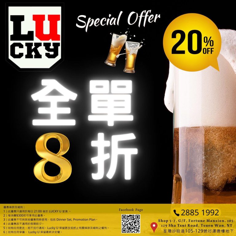 由即日起,晚上9點後於LUCKY U 堂食消費滿$300,即享全單8折優惠!