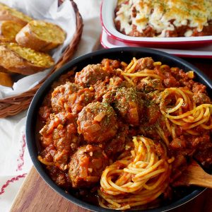 Delight in the vibrant flavors of our Tomato Chili Meatballs and Crab Spaghetti, a unique and hearty dish that combines